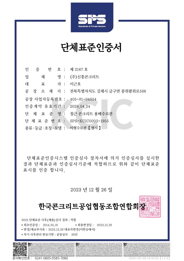 | 5 | SPS-KCIC0002-1955 철근 콘크리트 용배수로관 | 제 2167 호 |