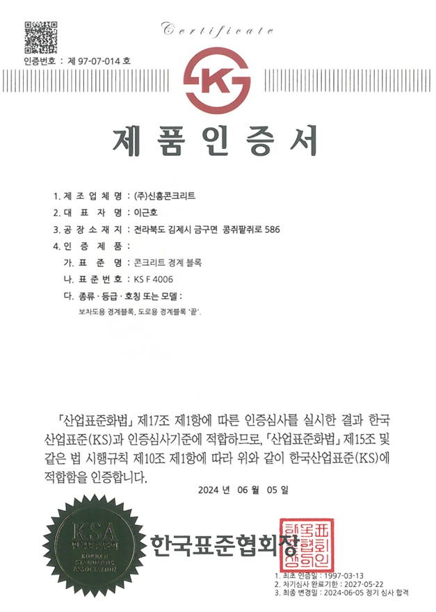 | 2 | KS F 4006 콘크리트 경계 블록 | 제 97-07-014 호 |