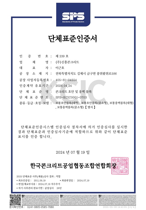 | 4 | SPS-KCIC0001-0703 콘크리트 호안 및 옹벽블록 | 제 239 호 |
