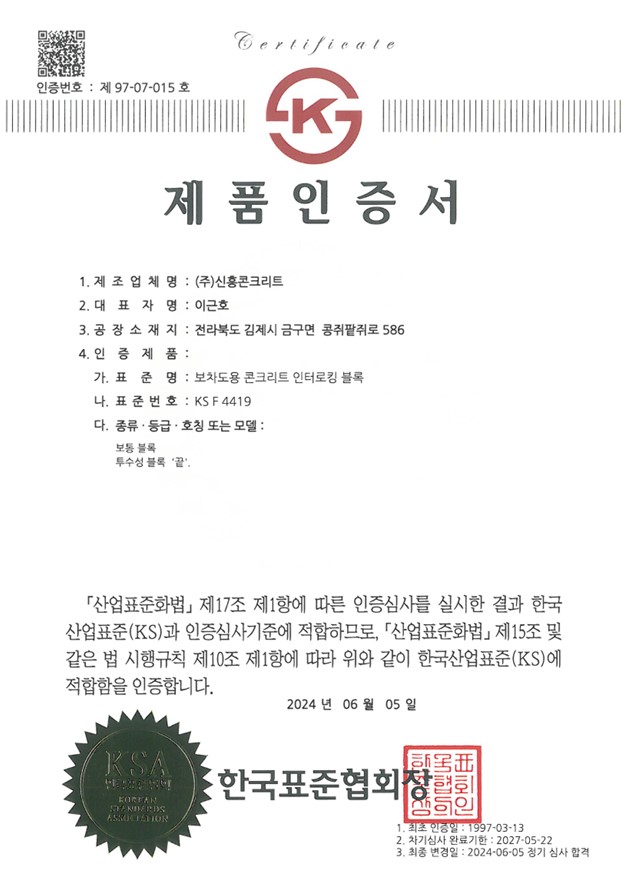 | 3 | KS F 4419 보차도용 콘크리트 인터로킹 블록 | 제 97-07-015 호 |