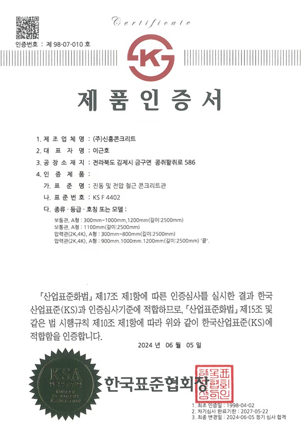 | 1 | KS F 4402 진동 및 전압 철근 콘크리트관 | 제 98-07-010 호 |