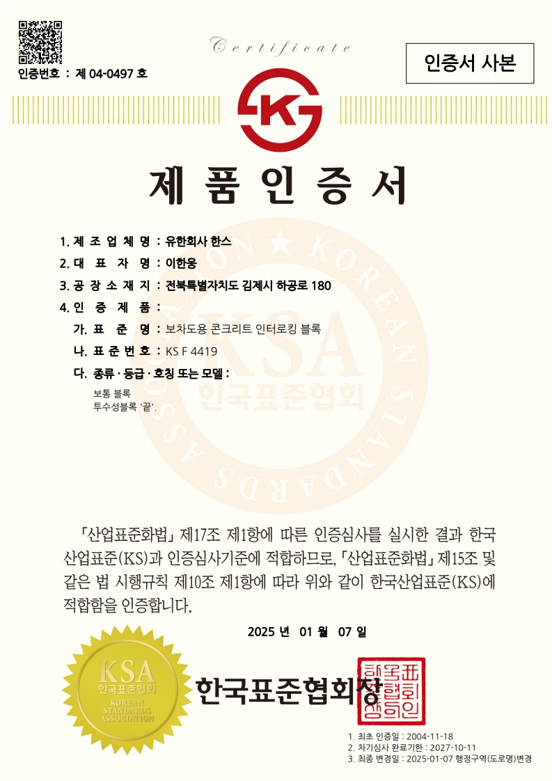 | 1 | KS F 4419 보차도용 콘크리트 인터로킹 블록 | 제 04-0497 호 |