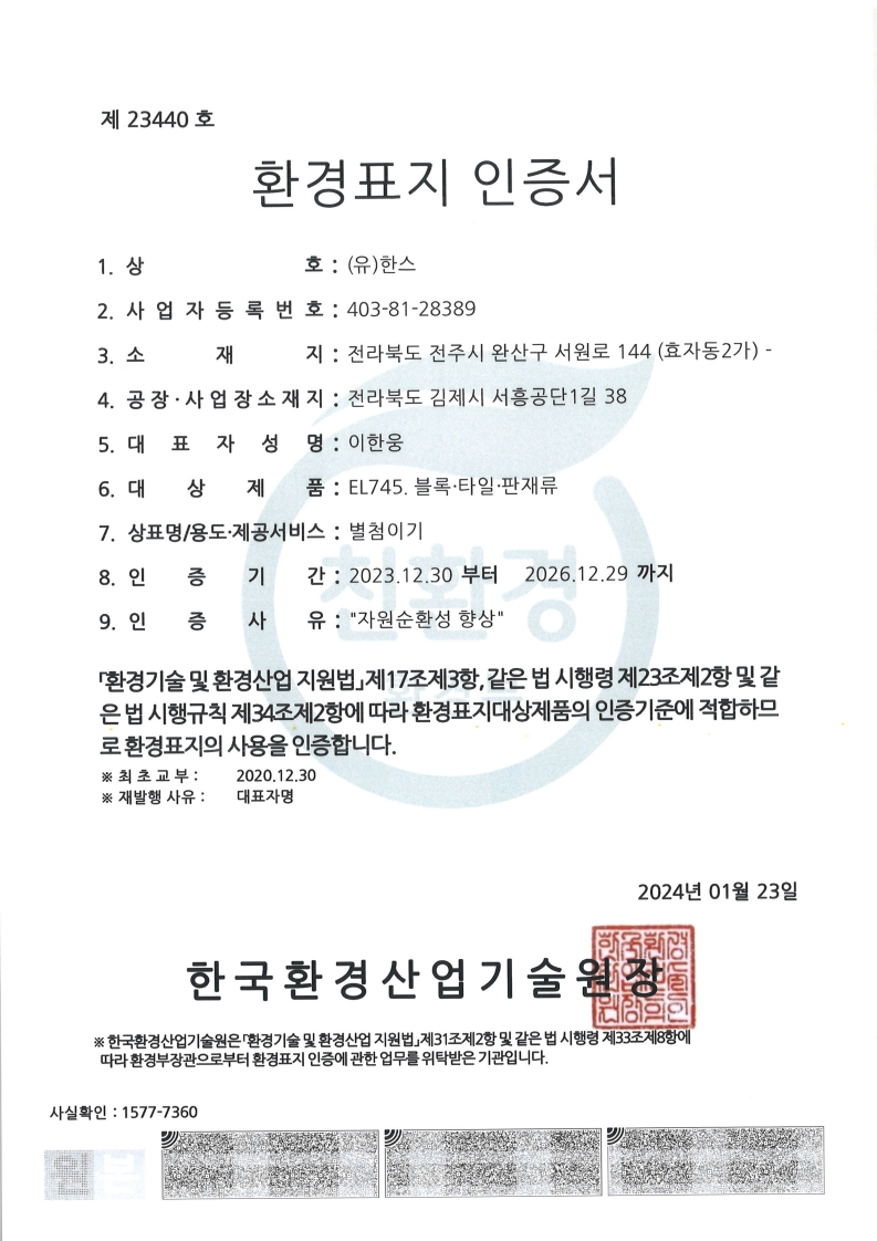 | 5 | 환경표지 인증서 블록, 타일, 판재류 | 제 23440 호 |