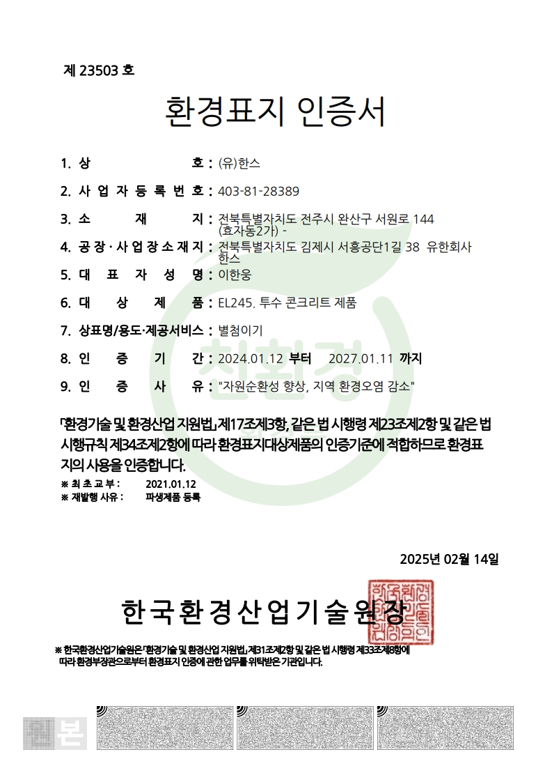 | 4 | 환경표지 인증서 투수 콘크리트 제품 | 제 23503 호 |
