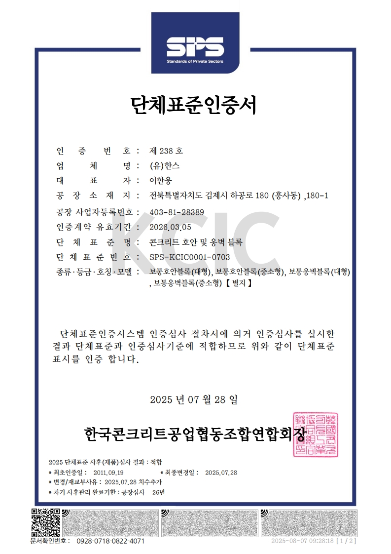 | 3 | SPS-KCIC0001-0703 콘크리트 호안 및 옹벽블록 | 제 238 호 |