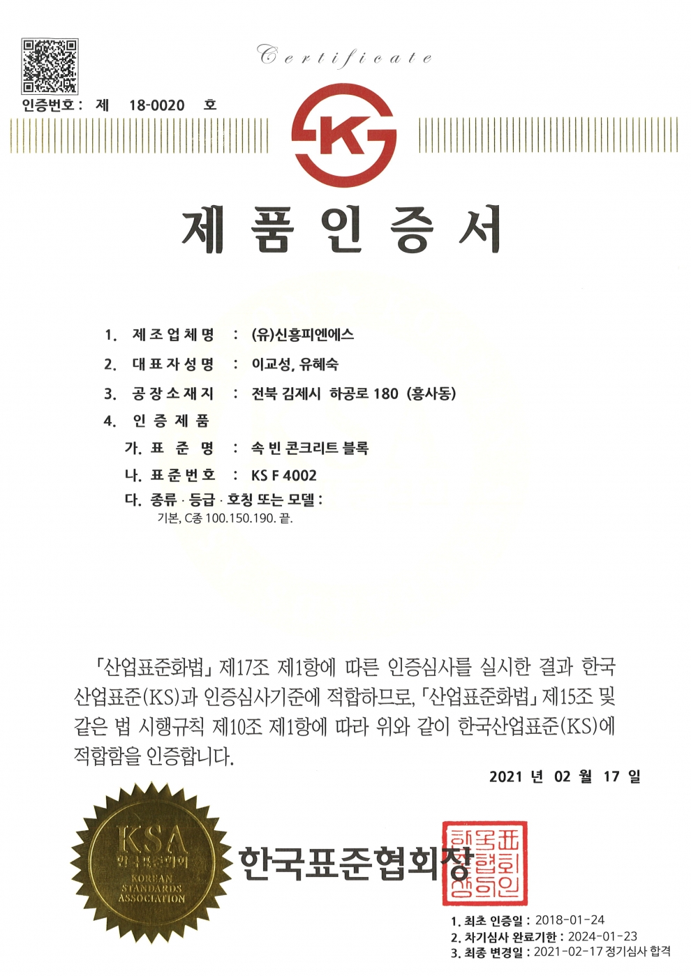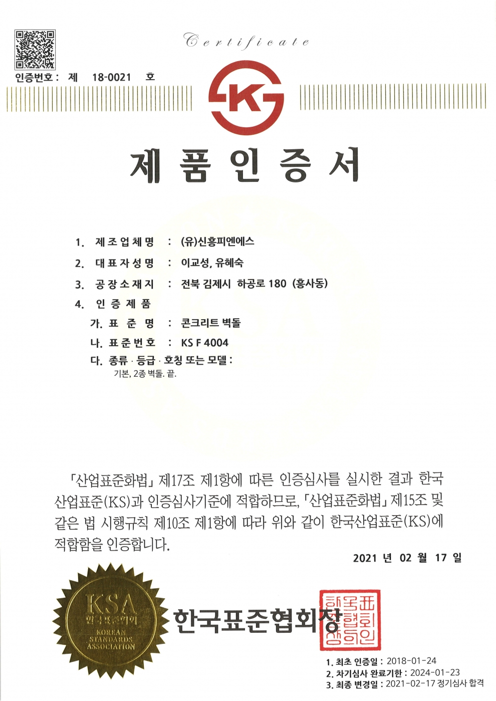 2 | KS F 4004 콘크리트 벽돌 | 제 18-0021 호 |