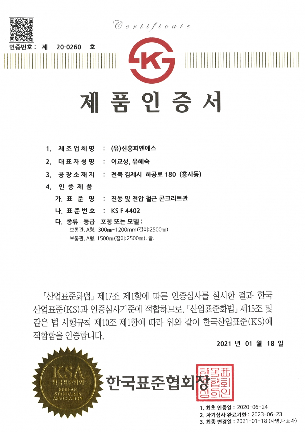 1 | KS F 4402 진동 및 전압 철근 콘크리트관 | 제 20-0260 호 |